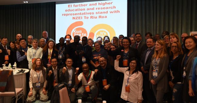 Concernant les Objectifs de développement durable (ODD) et l'enseignement supérieur, Edwards a déclaré que l'IE demande toujours l'abolition des frais de scolarité et l'adoption de mesures visant à réduire de manière significative les coûts indirects de l'enseignement supérieur. Un bref sondage a été distribué le premier jour et les réponses seront prises en compte dans un projet de recherche visant à identifier et à mieux comprendre les perceptions et la compréhension des éducateurs/trices quant aux progrès relatifs aux ODD. Cette recherche sera présentée à l'occasion de l'Assemblée générale 2019 des Nations Unies, où les gouvernements du monde entier se réuniront pour assurer le suivi des progrès des objectifs éducatifs liés aux ODD.